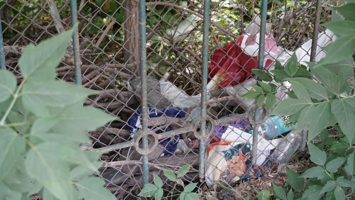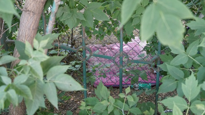 Помимо мусора, за забором виднеется что-то напоминающее матрас.