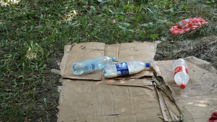 Здесь разбросаны какие-то вещи, бутылки и матрасы. Того человека, который чуть ранее прилег сюда отдохнуть, уже на месте не было.