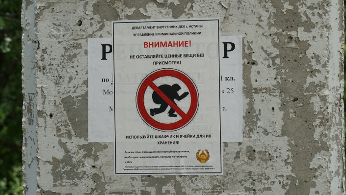 На заборе бросается в глаза обращение управления криминальной полиции Астаны к жителям, чтобы те были бдительны и не оставляли ценные вещи и велосипеды без присмотра.