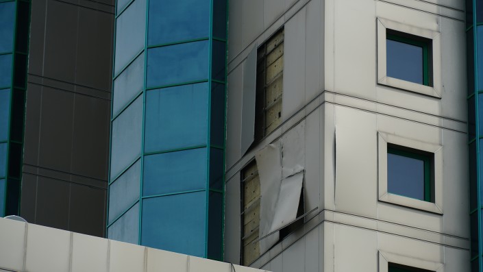 Местами сорвана облицовка здания.