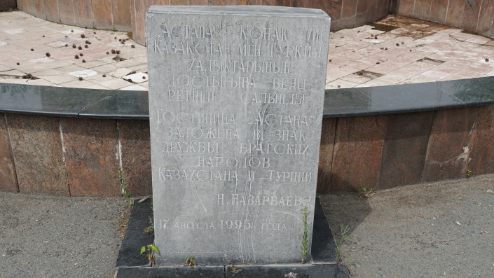 А еще возле этой гостиницы есть примечательный камень, на котором написано, что эта гостиница заложена в знак дружбы братских народов Казахстана и Турции. И подпись: "Н. Назарбаев. 17 августа 1995 года".