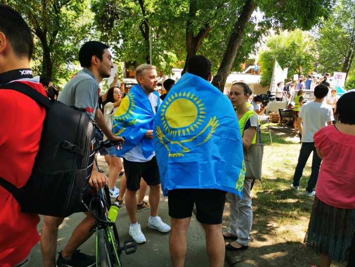 "Астана" велокомандасының спорттық киімін киіп келген (расында өтіп бара жатып, қосылған да болуы мүмкін) мына спортшының топқа қосылмай, жырақтан ғана байқап, мінберге шыққандарды мұқият тыңдап тұрған сәтінен түстік. Оның бұл шараға арнайы келген-келмегеніне болжам жасамай-ақ қоялық. Қайткен күннің өзінде жиналған халық қарасын көбейткендердің ішінде кездейсоқ жүргендер болды.