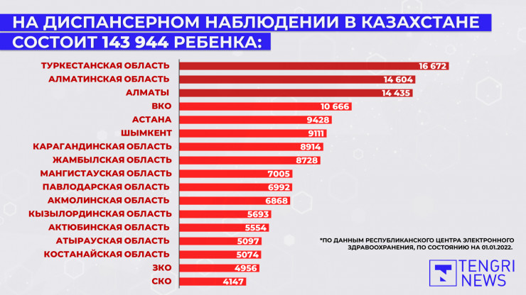 Какие болезни чаще всего переносят дети? Сколько реабилитационных центров в стране, оказывающих помощь детям с особыми потребностями? И какой регион лидирует по детским болезням? Ответы на эти и другие вопросы - в материале Tengrinews.kz.