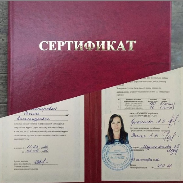 Получить сертификат сурдопереводчика для меня было совсем несложно. В Алматы есть общество инвалидов "Умит", я пришла, купила книгу, прочитала ее за несколько часов, мне назначили день экзамена, сдала. Так как я из семьи глухонемых, то они просто посмотрели, как я разговариваю жестами. Я сама не ожидала, что все будет так быстро и просто. В этом же обществе проводят уроки, учат с нуля, есть группами, есть индивидуально.