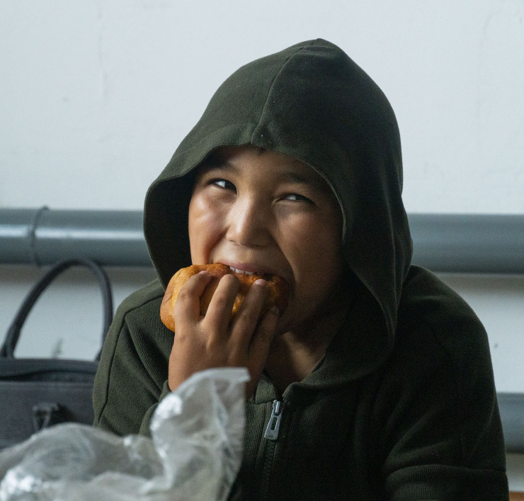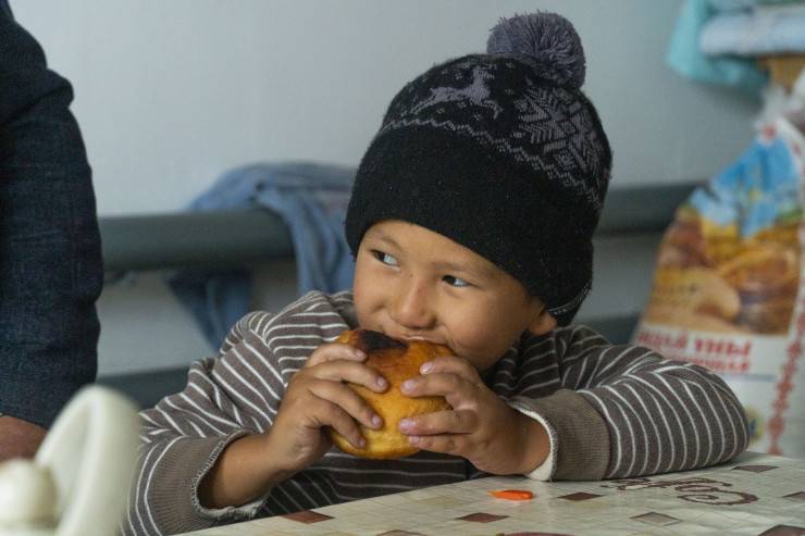 Семья Алимбековых вернулась домой и собралась пить чай. Я обратил внимание на деток, один из них в этот пасмурный дождливый день дома бегает в шапке.