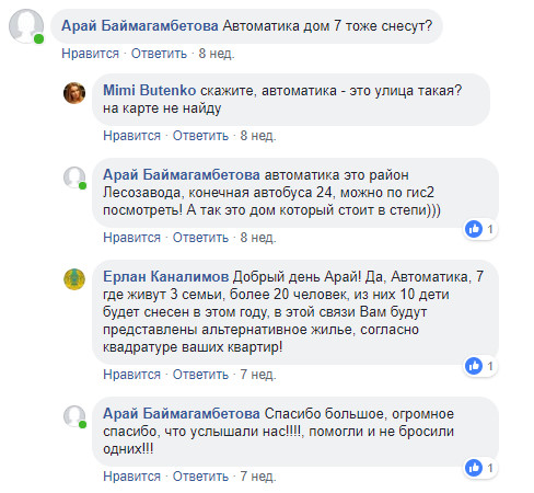 "Автоматика, 7, где живут три семьи, более 20 человек, из них 10 - дети, будет снесен в этом году. В этой связи вам будет предоставлено альтернативное жилье согласно квадратуре ваших квартир!" - поспешил обрадовать жителей аким. Судя по записи, с того момента прошло семь недель. И жители дома № 7 забеспокоились.