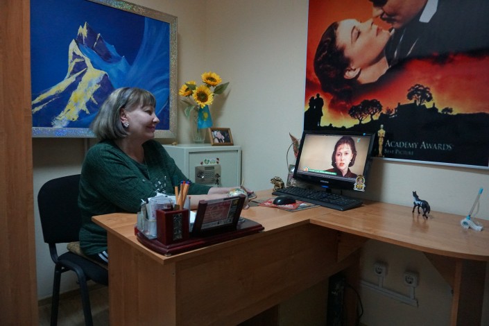 На стенах ее офиса с одной стороны плакат кинофильма "Унесенные ветром", с другой - картина, напоминающая работы художника и философа Николая Рериха.