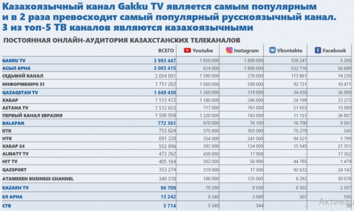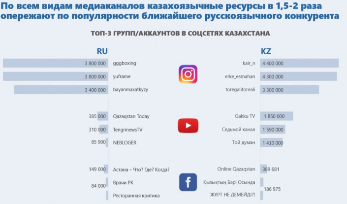 По словам экспертов, на сегодняшний день казахоязычные медиа "показывают бешеную динамику роста". Согласно данным из открытых источников, количество подписчиков и пользователей, а также просмотров на казахоязычных страницах в социальных сетях в разы превышает русскоязычные.