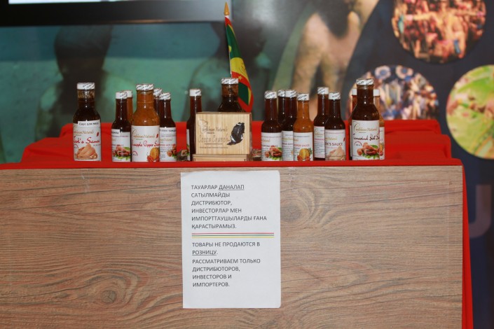 В конце коридора можно было приобрети острые соусы по цене от 1 500 до 2 500 тенге за бутылочку.