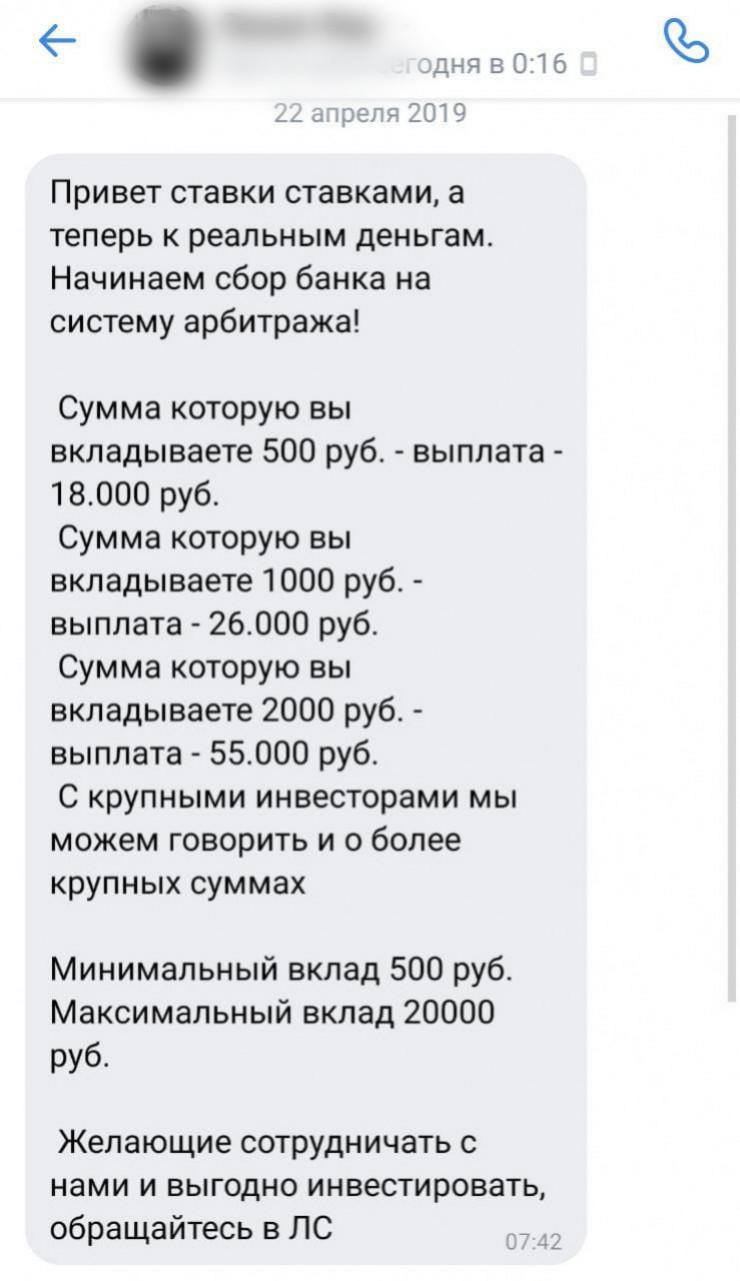 Незнакомцы предлагали заработать на конкретных событиях в спорте. За небольшой вклад они гарантировали выигрыш, но на самом деле понятно, что это мошенничество.