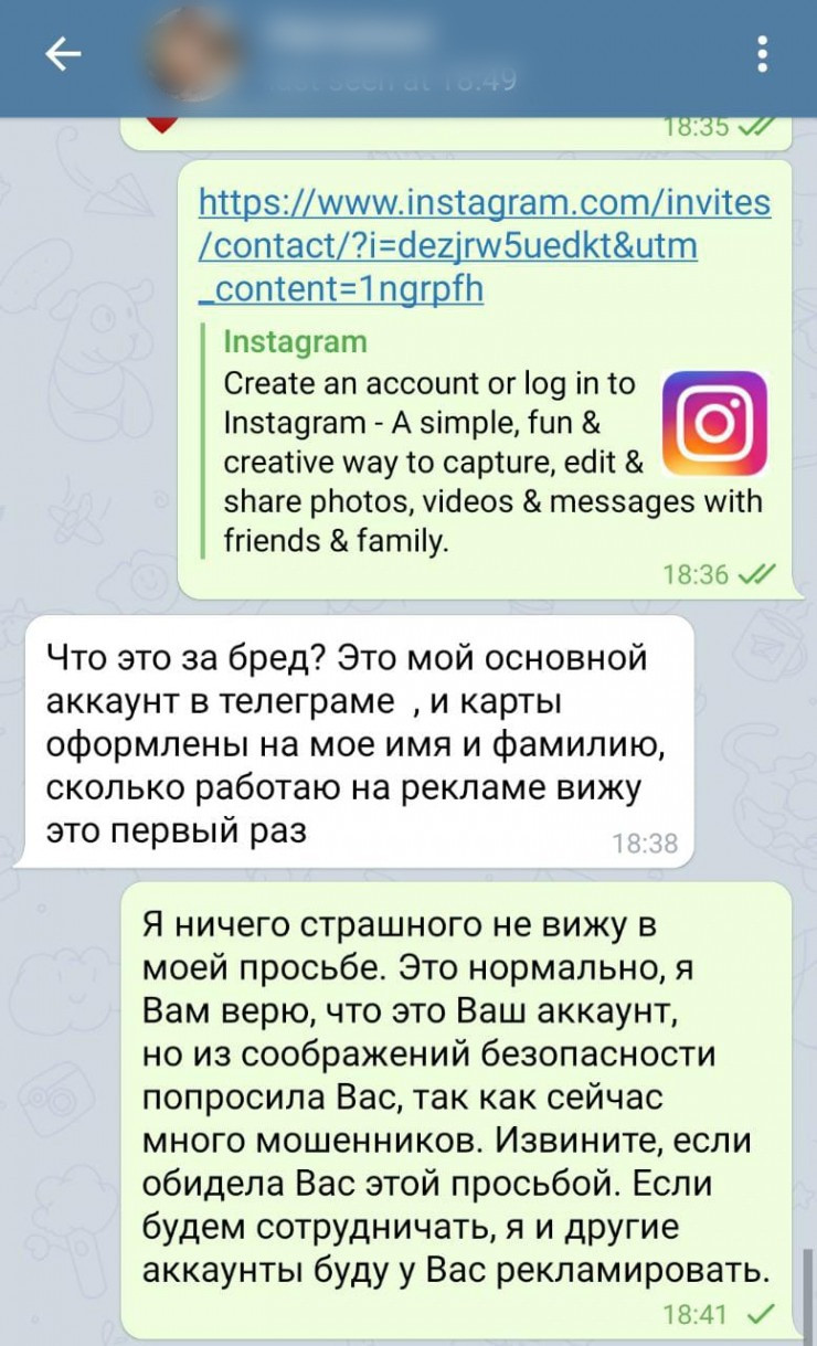 Как выяснилось, эта девушка пользовалась фотографиями успешных блогеров и от их имени предлагала рекламу в Telegram.