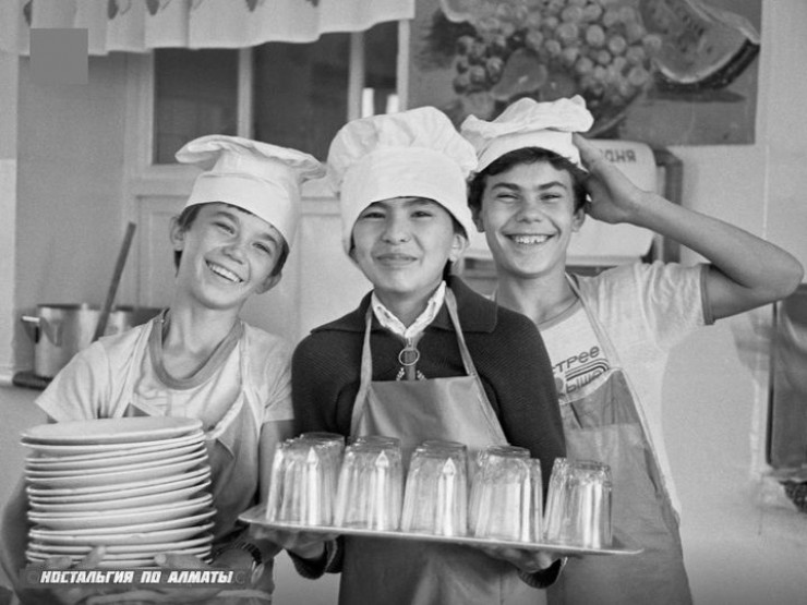 От следующего фото становится как-то тепло на душе, а улыбка на лице появляется как бы в ответ смеющейся ребятне. Это 1989 год. На снимке дежурные в школьной столовой: Саша Маслич, Канат Искаков и Ермек Абдулов. Интересно, где они сейчас?