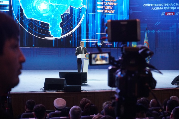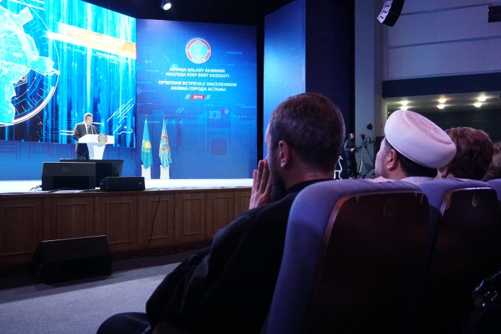 К микрофонам выстроились очереди, чтобы задать вопрос акиму. Люди спрашивали, Бахыт Султанов отвечал. В какой-то момент по уже сложившейся традиции слово взял Сансызбай Есилов (председатель городского Общественного совета), который произнес стандартную речь о том, что пора прекратить задавать вопросы в зале, потому что после этого аким начнет личный прием граждан.