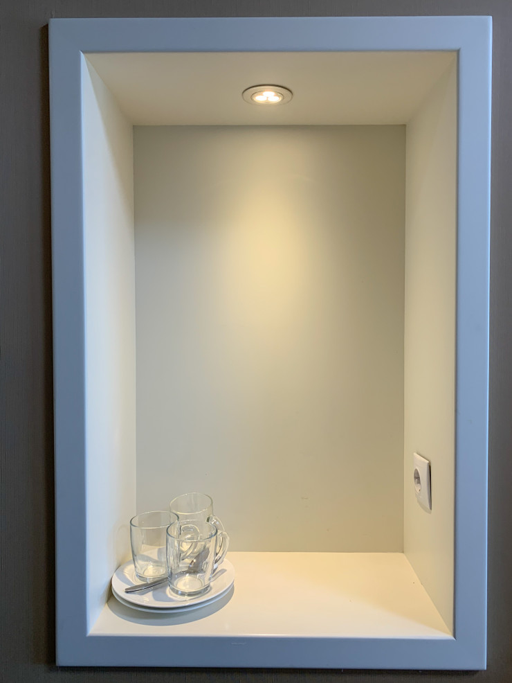 Причем внутри сохранен весь узнаваемый антураж, например, выемка в стене со стаканами и подсветкой или светящийся номер при входе.