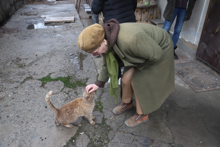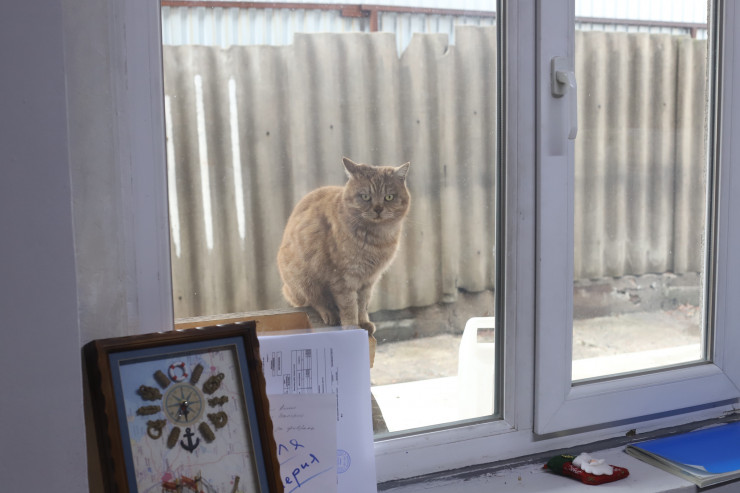 Возле офиса, где должна пройти наша встреча, первым нас встречает славный рыжий кот. Как оказалось, он здесь не один, тут поселилась целая кошачья банда. Девушки, сотрудницы фонда "Реванш", куда мы, собственно, и пришли, подкармливают ее. И первое, что бросается в глаза, когда заходишь внутрь, - это интерактивная доска, где, помимо рабочих планов, крупным шрифтом написано, что в первую очередь обитатели должны покормить кошек.