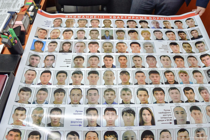 Капитан полиции Диас Кадыров показывает нам плакат с фотографиями 70 воров, которые орудуют в столице Казахстана. На самом деле всего преступников, специализирующихся на квартирных кражах, на учете Департамента внутренних дел Нур-Султана состоит порядка 2000 человек.