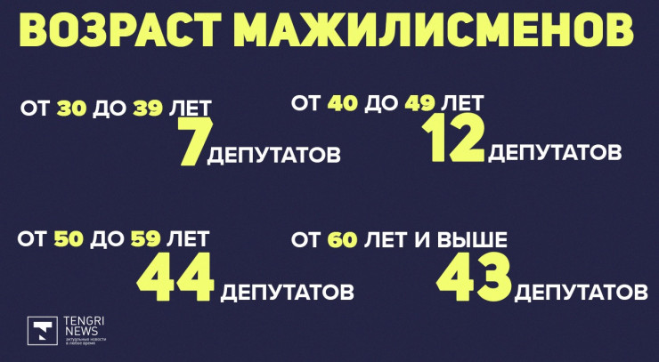 Старше 65 лет в Мажилисе - 21 депутат: в возрасте от 65 до 70 лет - 10 депутатов, от 70 до 80 - 9 мажилисменов, один человек старше 80 лет.