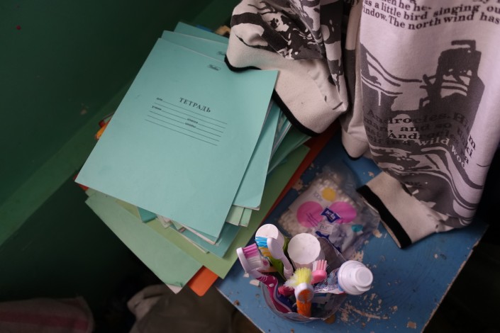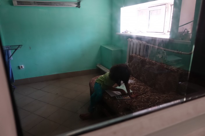Пока посетителей в автомойке нет, дочь Исатая Инабат смотрит мультики и параллельно разглядывает акварельные краски и тетради, которые ей и ее старшему брату к началу учебного года привезли неравнодушные люди.
