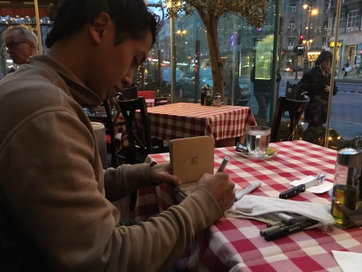 Если у вас есть навыки рисования, отдельно обучаться скетчингу нет необходимости, считает казахстанец. "Я окончил художественную школу и после интенсивно начал заниматься с художником в Павлодаре. Первые дни учебы мы садились возле рынка летом, и учитель просила сделать 100-150 набросков углем, карандашом или маркером, неважно. Благодаря этому я смог натренировать взгляд, руку. Понять, что важно или нет, какие акцентировать детали. А быстро рисовать я научился на летних курсах в  Санкт-Петербургском государственном академическом институте живописи, скульптуры и архитектуры имени Репина", - продолжает парень.