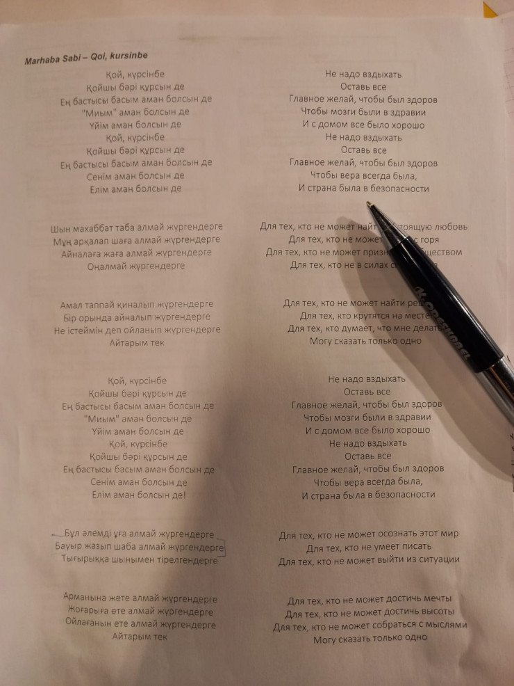 Прошло два часа. После того как новое правило все усвоили, а диалоги повторили, переходим к песням. Эту часть встречи все воспринимают с особым удовольствием. Суть каждой песни сначала подробно разбирают, а потом под музыку хором исполняют. Сегодня мы изучили композиции Мархабы Саби и Дос-Мукасана. Скоро добавится просмотр мультфильмов на казахском языке. Это будет что-то простое, доступное даже для новичка.