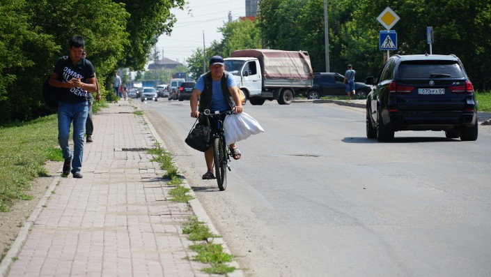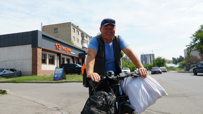 Утром Болатбек загружает товаром велосипед и отправляется на нем к своей торговой точке.