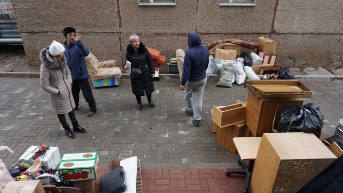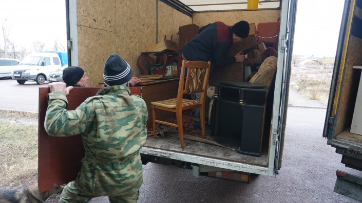 Люди грузят мебель и другие вещи в "Газели". Местные жители получили ключи от новых квартир и переезжают.