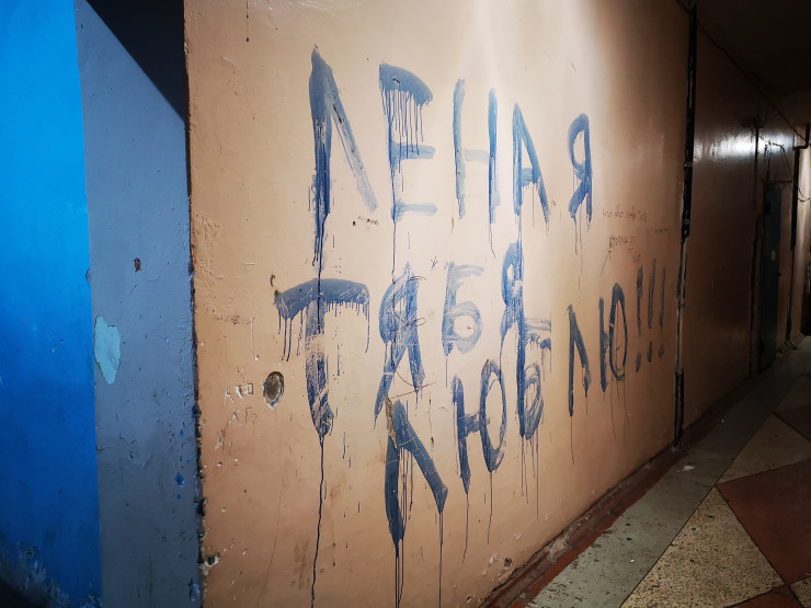 Заходим внутрь. Общежитие делится на две части - левую и правую. В общем коридоре на первом этаже кто-то большими буквами написал признание в любви.