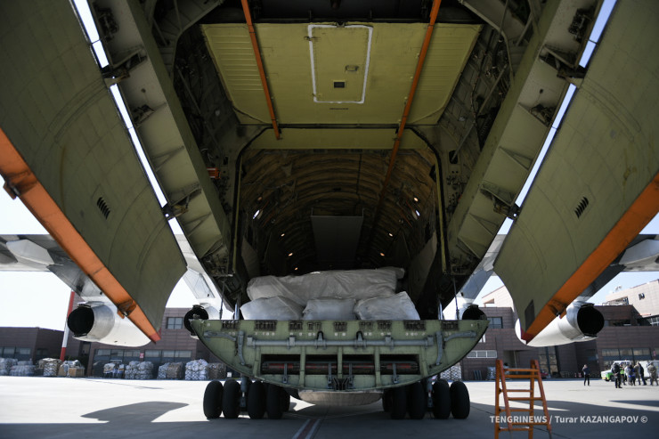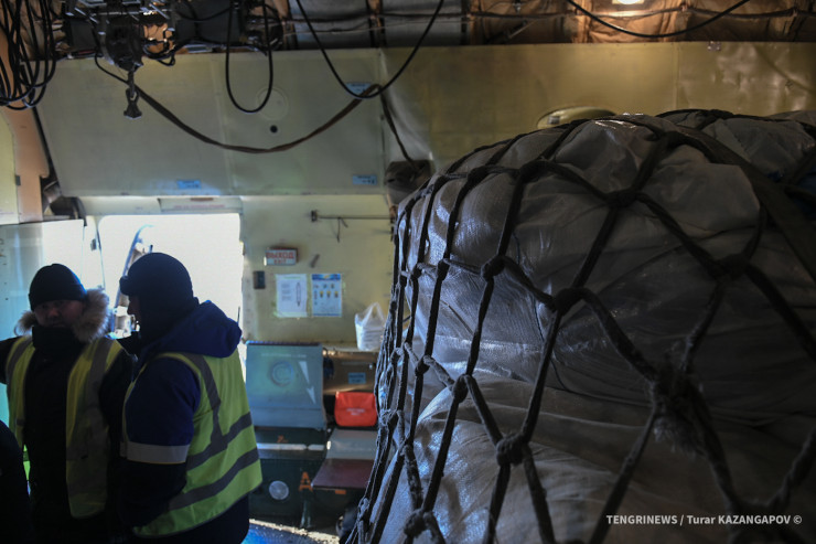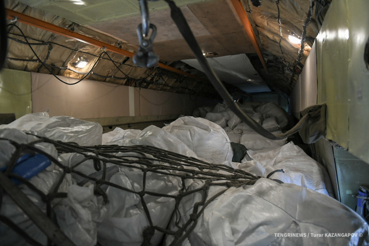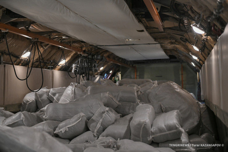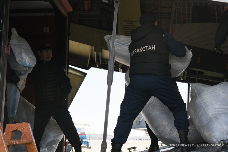 Казахстанские спасатели выстраиваются в цепочку и начинают выгружать из самолета десятки тяжелых мешков.