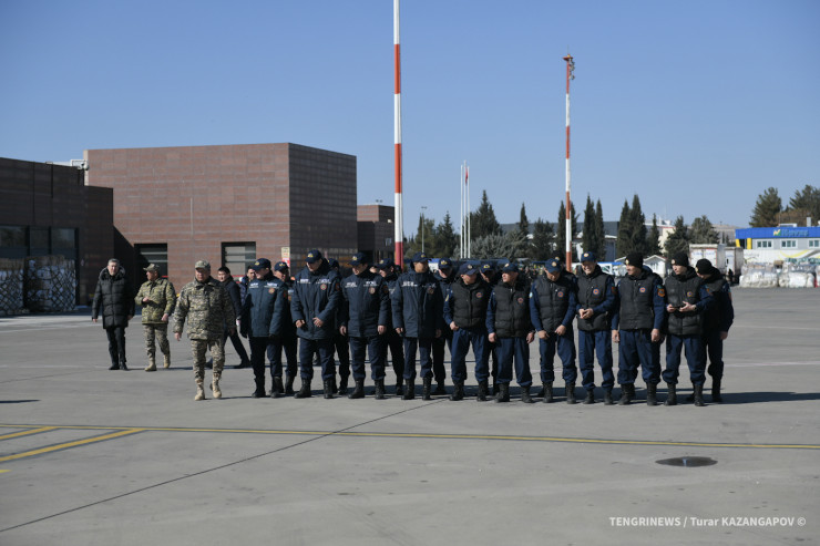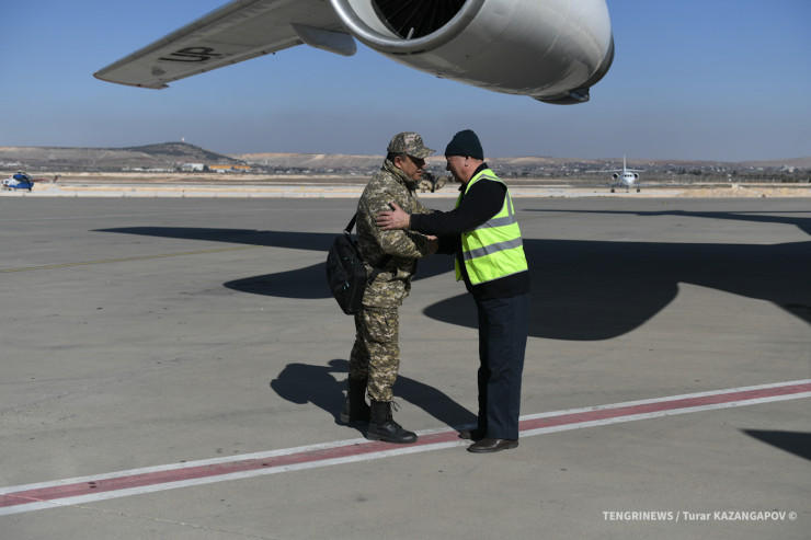 В аэропорту самолет встречает одна из групп казахстанских спасателей. Ребята помогут в разгрузке, а потом этим же бортом вернутся домой.