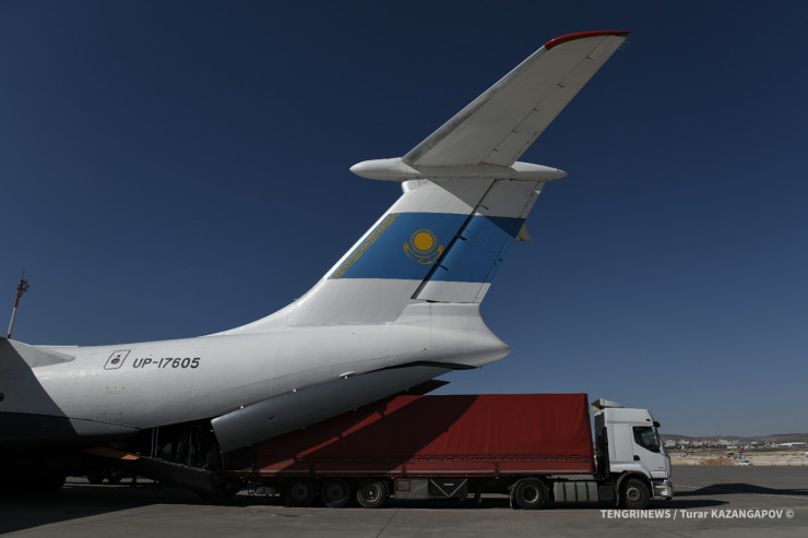С борта груз отправляется в огромные фуры, которые в дальнейшем разъедутся по тем регионам, где в гуманитарной помощи от Казахстана нуждаются больше всего.
