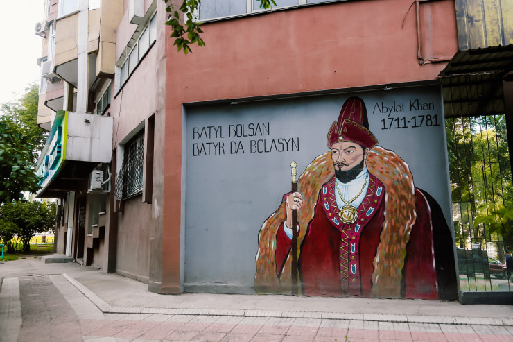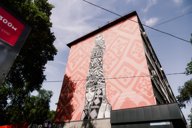 Вот еще один интересный мурал. Изображен на доме в районе улиц Абая-Момышулы.