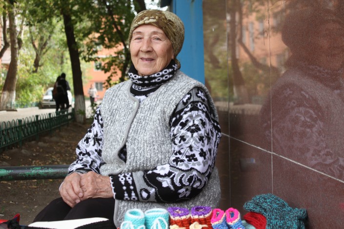 В другом районе Астаны, тоже в старой части, на торговлю вышла Ольга Ивановна. Она продает вязаные вещи. Признается, что хоть это занятие и приносит ей небольшую прибавку к пенсии, но все же это не главное. На улицу с товаром она выходит в том числе и для того, чтобы общаться с людьми.
