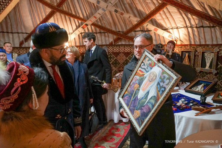 Его также познакомили с шедеврами искусства казахстанских художников, дав возможность забрать одну из понравившихся картин. Клеверли выбрал полотно с изображением бабушки с белым платком - кимешеком.