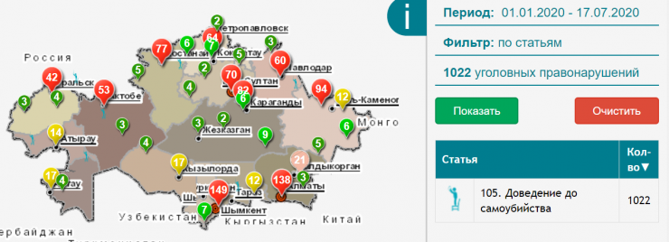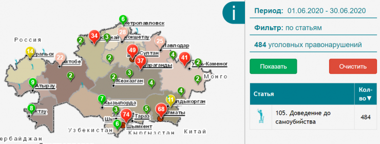 P. S. Отметим, что с 19 марта по 7 июля 2019 года было зарегистрировано 17 случаев доведения до самоубийства. Такие данные обозначены на Карте преступности. Согласно ответу Комитета по правовой статистике и специальным учетам Генпрокуратуры, на самом деле было зафиксировано 926 случаев, но по результатам досудебного расследования 809 дел были прекращены в связи с отсутствием состава или события преступления.