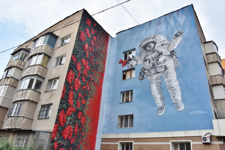 Мурал "Независимость", расположенный на фасаде дома в микрорайоне Мамыр-3 в Алматы, был создан в 2018 году. Авторы: Саид Атабеков, DOXA (Кыргызстан). Мурал посвящен первому казахскому космонавту Токтару Аубакирову. Фото drmfund.com