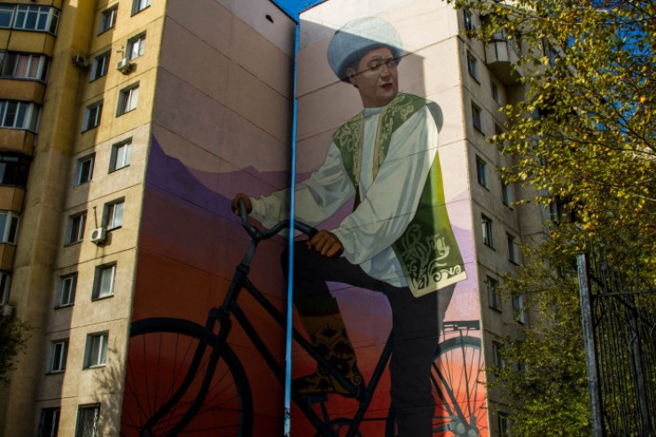 Как и многие его муралы, работа в Алматы посвящена мотивам людей и природе. На расписанном фасаде южной столицы Казахстана был изображен молодой мужчина в национальном костюме на велосипеде на фоне гор.