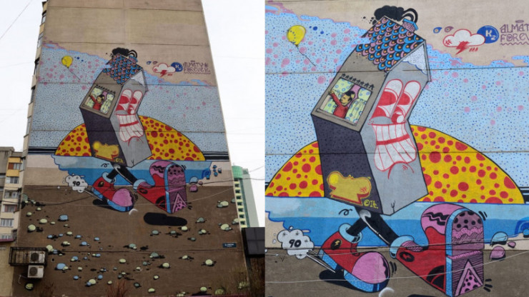 В октябре прошлого года алматинцев потрясло уничтожение знаменитого мурала с апашкой, который украшал ранее неприметную стену жилого дома по улице Сейфуллина. Оказалось, что строители при ремонте фасада жилого дома попросту закрасили "картинку". Через общественный резонанс этот мурал удалось восстановить.