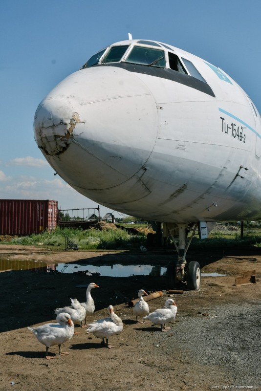 Легендарный Ту-154 в карагандинской степи, в окружении высокой травы и гусей. Где-то за будкой лают собаки, стерегущие, по всей видимости, железную махину.