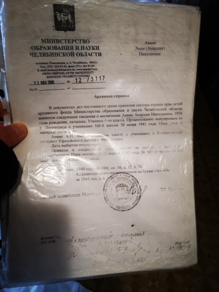 В качестве доказательства пенсионерка демонстрировала мне бумагу, в которой говорится об Аввик Анархии Николаевне 1930 года рождения. В архивной справке из Челябинской области отмечается, что она ученицей четвертого класса была эвакуирована из Ленинграда. Отец умер, с матерью связи нет.
