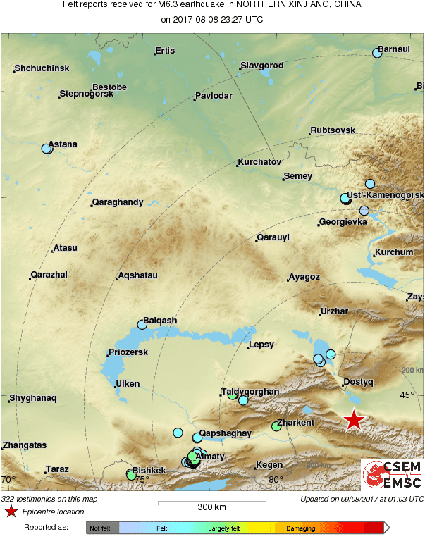 Напомним, произошедшее в Китае землетрясение почувствовали и в Казахстане. По данным ГУ "СОМЭ КН МОН РК", подземные толчки ощутимостью 4 балла почувствовали жители Алматы, Талдыкоргана и Жаркента. В Караганде и Усть-Каменогорске -2 балла.