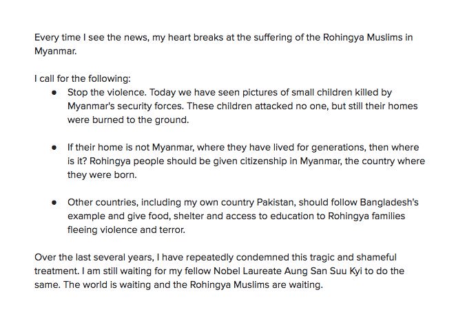Малала отметила, что страдания рохинджа разбивают ей сердце, и призвала лидера Мьянмы, тоже нобелевскую лауреатку, осудить насилие против меньшинства. "В последние годы я неоднократно осуждала эти трагичные и позорные события. И я по-прежнему жду, чтобы Аун Сан Су Чжи, как и я, получившая Нобелевскую премию, поступила так же. Весь мир и мусульмане-рохинджа тоже ждут", - написала она.