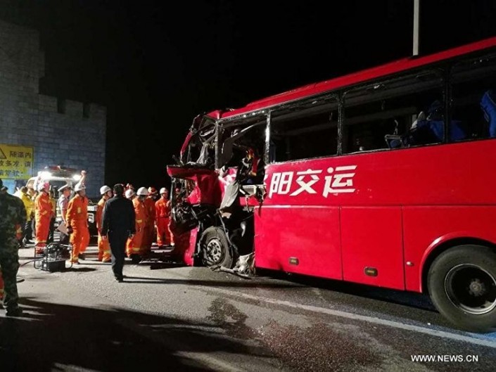 По предварительным данным, автобус, направлявшийся из города Чэнду (провинция Сычуань) в Лоян (провинция Хэнань), при въезде в тоннель на скоростном шоссе "Пекин-Куньмин" по неизвестной причине врезался в стену.