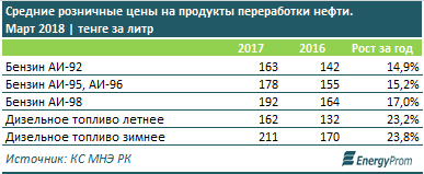 Летнее дизельное топливо подорожало за месяц на 1 процент, его цена составила в марте 2018 года 162,1 тенге за литр (рост за год - на 23,2 процента). Зимнее дизельное топливо, наоборот, подешевело за месяц на 0,4 процента, до 210,8 тенге. В то же время годовой рост стоимости зимнего дизтоплива достиг сразу 23,8 процента.
