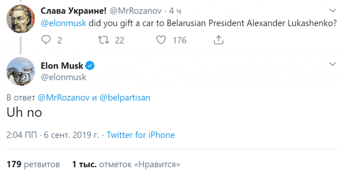 Через несколько дней один из пользователей Twitter решил уточнить у главы Tesla, дарил ли он президенту Беларуси автомобиль.