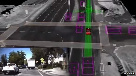 Вид из Google авто с автопилотом и изображение на экране компьютера во время его тестирования.
