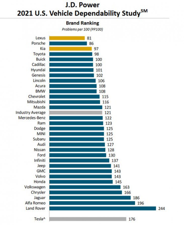 В этот раз в исследовании впервые принимали участие владельцы электрокаров Tesla, но в рейтинг эта компания вошла неофициально, поскольку не выдала J.D. Power разрешение на проведение опроса в 15 штатах США. В результате опросы провели в 35 других штатах, и по их результатам количество неисправностей машин Tesla составило 176 на 100 машин, это четвертый показатель с конца.