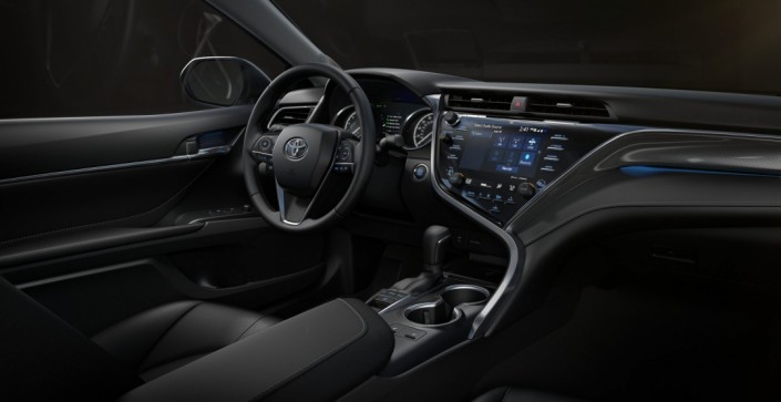Седан Toyota Camry 2018 модельного года получил полностью пересмотренный интерьер, который сочетает в себе "функциональность, футуристический стиль, уклон на личное пространство и высокий уровень исполнения". На заднем ряду автомобиля стало просторнее и комфортабельнее, а передние кресла спроектированы заново для улучшения эргономики. В салоне автомобиля можно обнаружить восьмидюймовый экран мультимедийной и навигационной системы, используемый также для климатических настроек, а также семидюймовый информационный монитор на приборной панели.