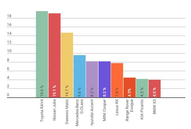 Участие в голосовании приняли 780 человек. "Если с исконно мужскими машинами все более-менее понятно, то идеальное авто для женщин подобрать крайне сложно. За помощью в этом вопросе мы обратились к читателям, предложив им право выбора из 10 вариантов: Daewoo Matiz, Kia Picanto, Mini Cooper, Hyundai Accent, Nissan Juke, BMW X3, Toyota RAV4, Range Rover Evoque, Lexus RX и Mercedes-Benz G-Class.