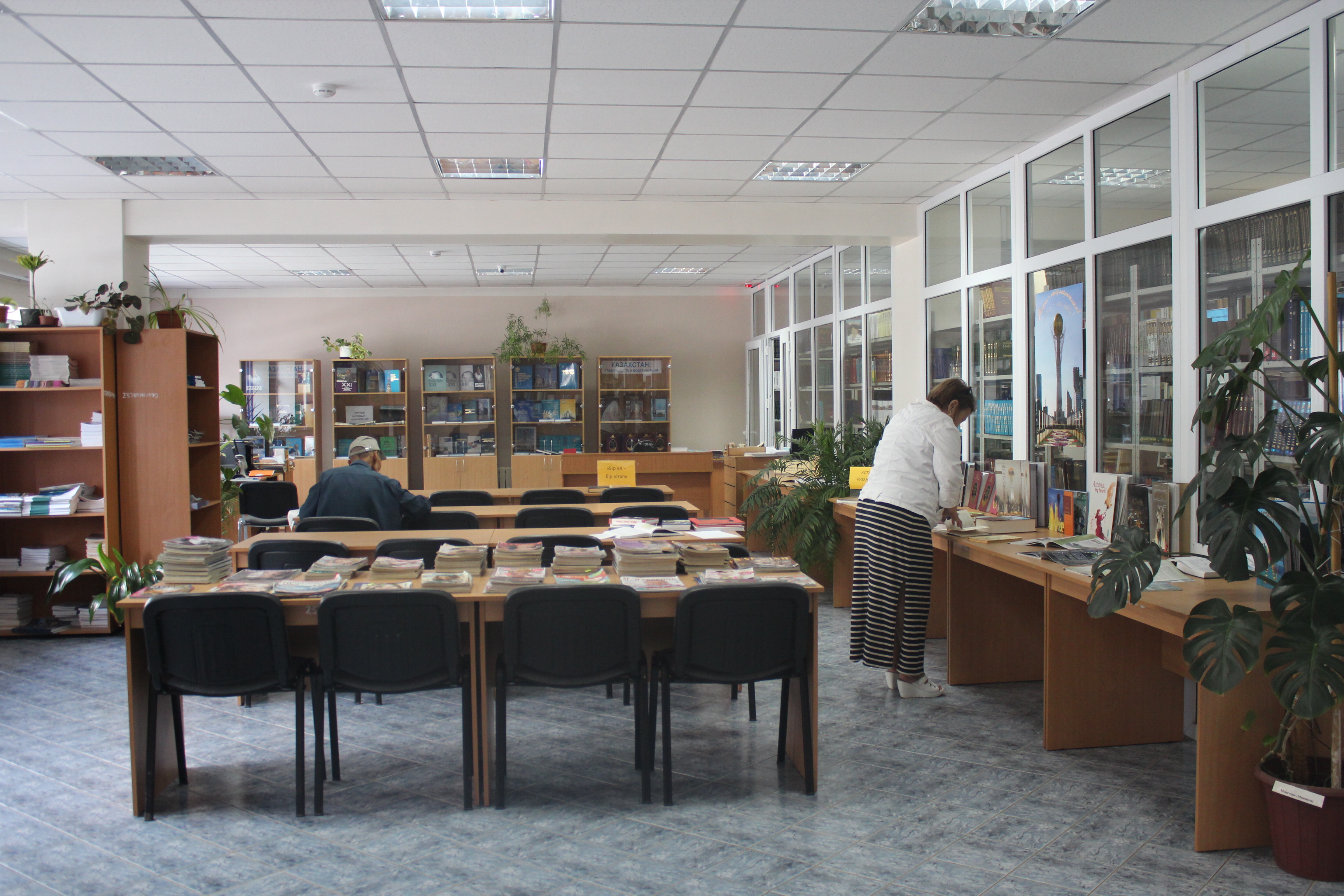 Заглянули мы и в зал научной литературы. По словам руководителя читального зала Куляш Оразовой, в летнее время читателей становится меньше. "В основном, студенты приходят, люди, которые занимаются научной деятельностью, абитуриенты, школьники. У нас очень много читателей: в день по 150-200 человек приходят", - сказала она. Библиотекарь отметила, что посетители часто запрашивают литературу по истории, медицине, спорту, искусству. Пользуются спросом книги на казахском языке.