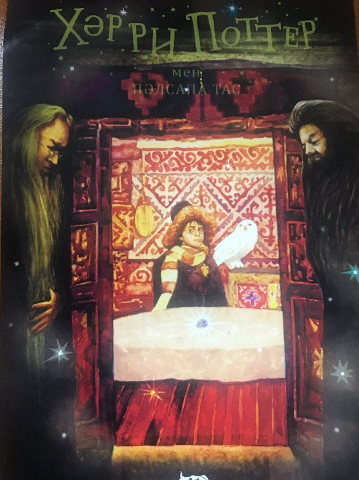 "Хәрри Поттер мен пәлсапа тас" кітабы 10 мың данамен шыққан. Басында баспа кітаптың мұқабасын қазақы нақышпен жасауға тырысқан. Алғашқы нұсқада Хәрри киіз үйдің ішінде, тымақпен бейнеленген. Оның артында домбыра мен ұлттық оюлар бар. Бірақ бұл нұсқаны Лондондағы баспа әлі қабылдамаған.